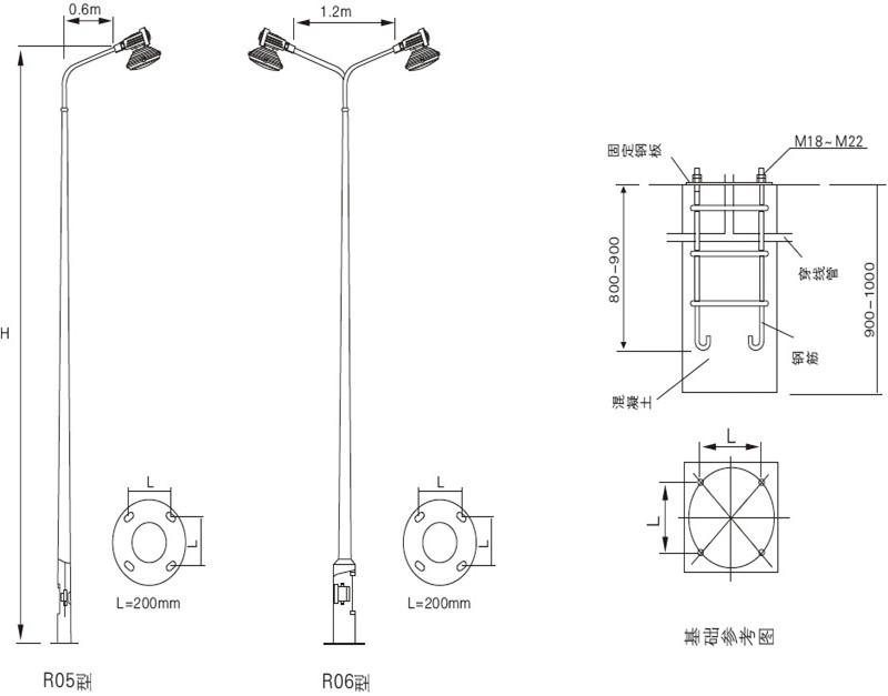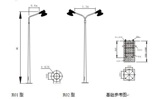 注:本路燈基礎(chǔ)圖適用于地基承載設(shè)計值f≥60kpa和最大風(fēng)力不超過11級,在山區(qū)及f<60kpa的弱軟地基的地區(qū),地質(zhì)情況比較復(fù)雜時,應(yīng)由當?shù)乜辈煸O(shè)計單位確定。本圖僅作參考。