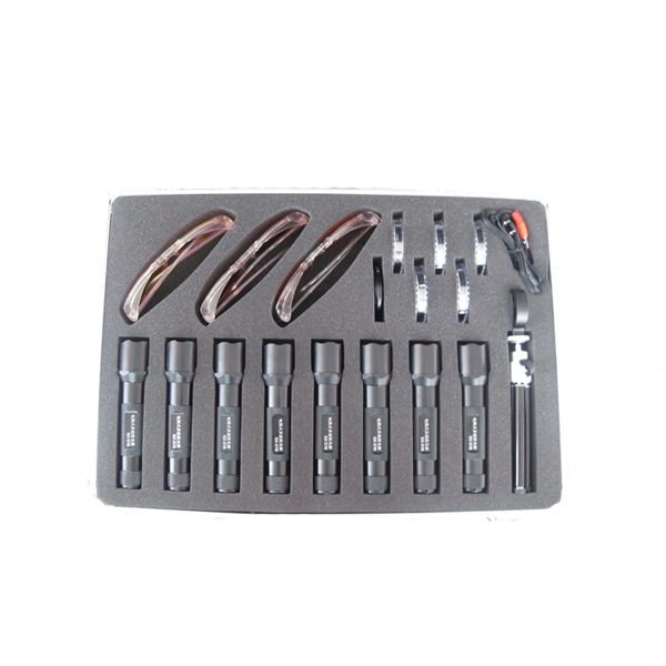 產(chǎn)品配件:手電筒八支、充電器一個(gè)、濾鏡七片、眼鏡三副、三腳架一個(gè)、高檔鋁盒一個(gè)